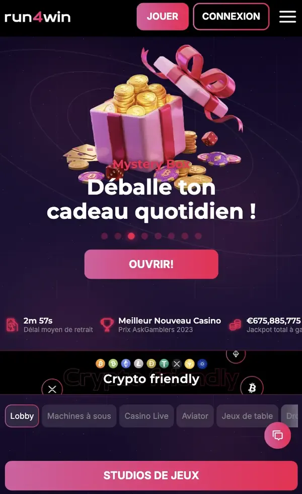 Notre lobby comprend 14 331 jeux, avec des catégories populaires telles que les machines à sous, les tables avec croupiers en direct et les jeux de type crash. Si vous aimez les tours rapides, notre sélection de machines à sous Run4win inclut des titres de fournisseurs comme Pragmatic Play, Relax Gaming, Hacksaw Gaming et Nolimit City. Si vous préférez le jeu en temps réel, notre casino live propose des jeux de studio propulsés par Evolution Gaming. Nous prenons également en charge les paris sportifs et proposons une offre de bienvenue sportive pour les fans de betting.